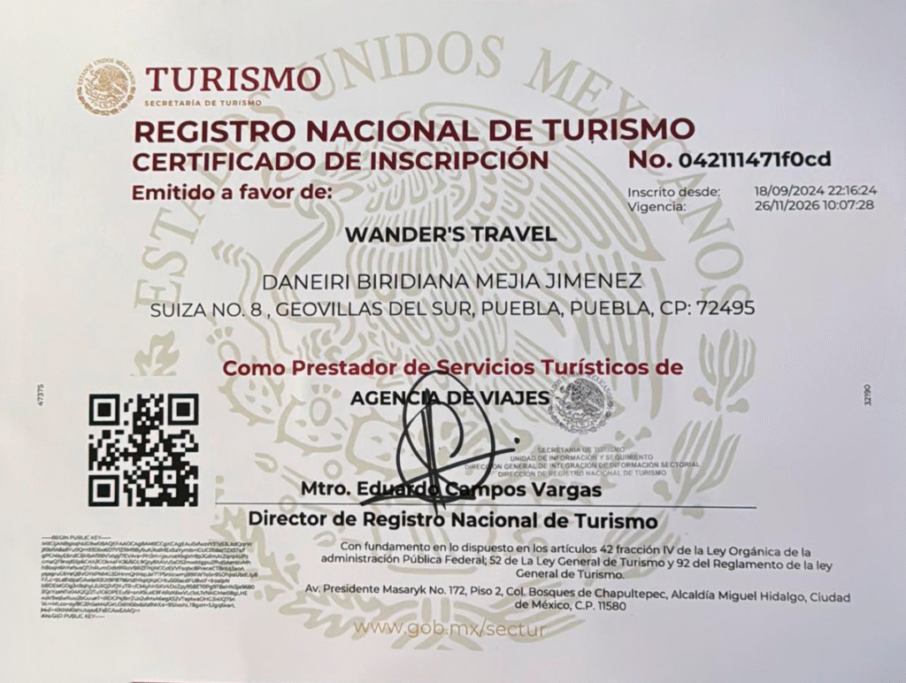 En Wander’s Travel contamos con el RNT y Certificado de Inscripción emitidos por la Secretaría de Turismo de México. Esto significa que somos una agencia formal y verificada.